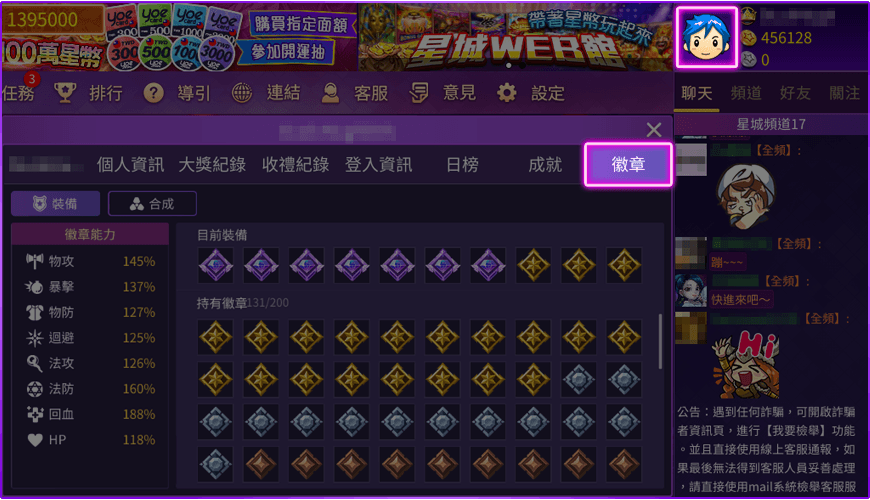 在個人資訊頁中,點選【徽章】來進行裝備和合成, 也可透過積分館內商店消耗PK幣購買。