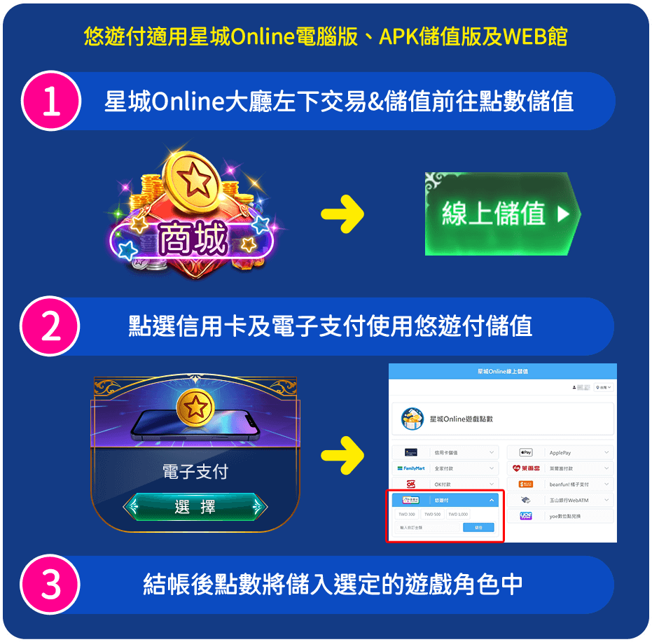 - 悠遊付適用APK儲值版、電腦版星城Online及WEB館。