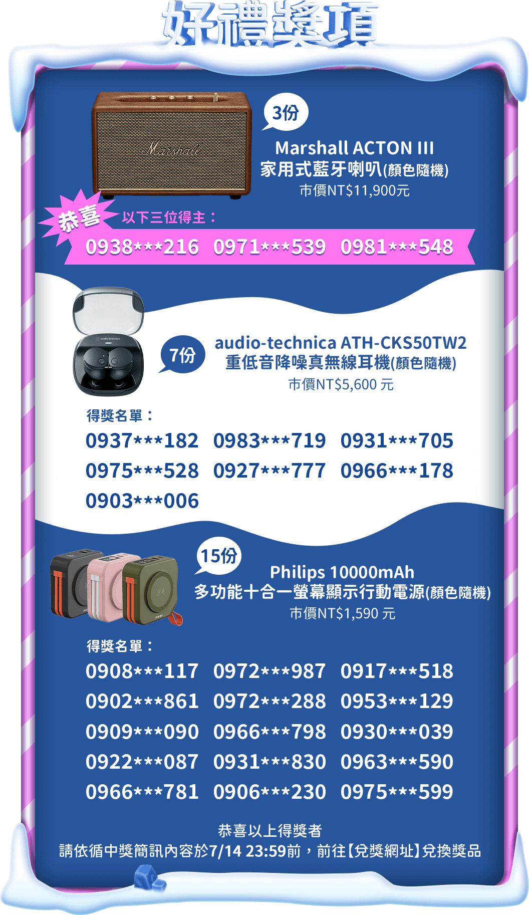 - 活動部分獎項將由簡訊發送至門號,若簡訊遺失或刪除,恕不補發。獎項兌換期限至2025/7/14 23:59止,逾期未兌換則視同放棄資格。抽中實體獎項的玩家,請主動來電與客服同仁聯繫、核對資料、填寫所得申報明細表。若超過時間而未主動聯繫者將喪失獲獎資格。後續收到中獎資料核對無誤,實體獎項寄出約30個工作天,實際天數需視商品貨源狀況評估,如遇缺貨可能遲至45個工作天以上,還請玩家見諒並耐心等待。實體商品寄送也僅限台灣本島地址。
