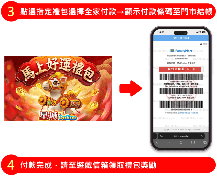 活動期間內綁定台灣手機門號,並使用全家付款購買馬上好運禮包 (售價NT$666,內含星幣66,600), 即可獲得抽紅包機會,包包都有獎,數量有限,送完為止!