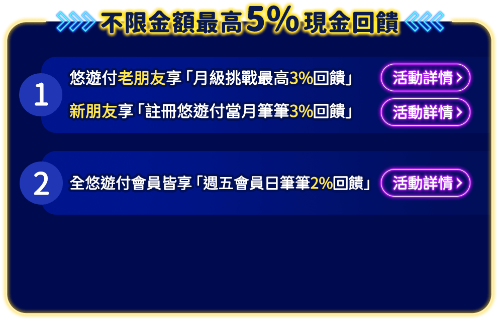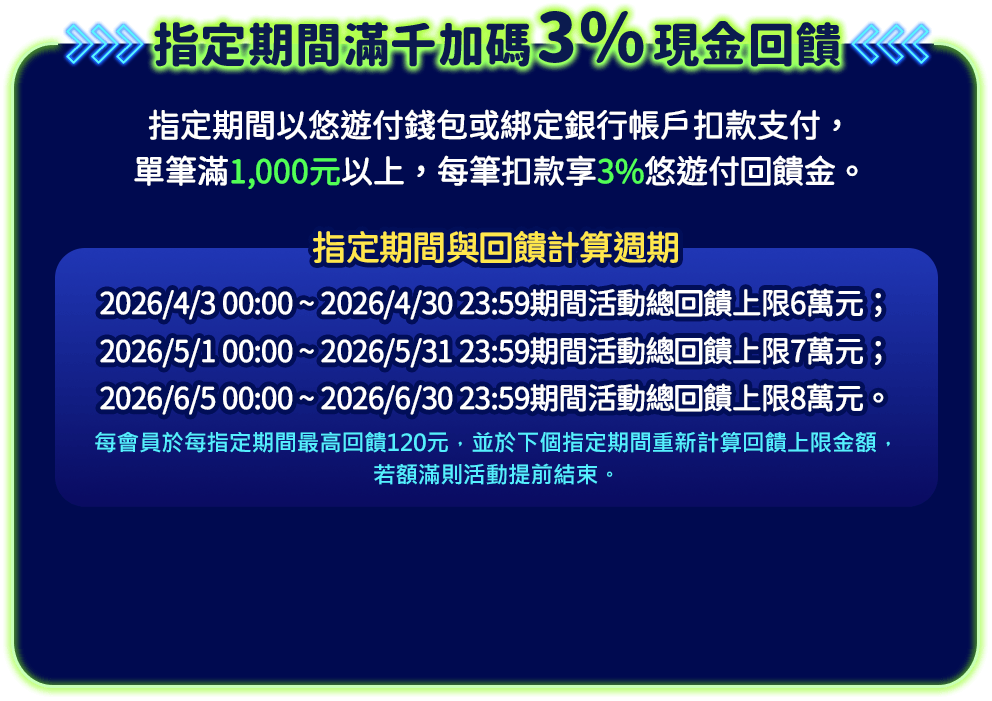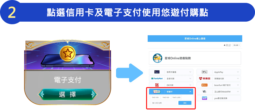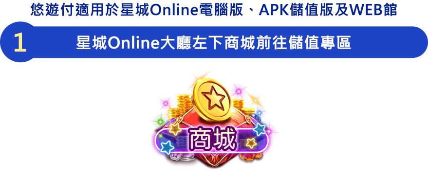 立即下載Easy Wallet APP註冊悠遊付 活動詳情 活動詳情 活動詳情 活動詳情前往了解 本活動時間:2026/4/1 00:00起~2026/6/30 23:59止。 悠遊付適用APK儲值版、電腦版星城Online及WEB館。 本活動僅限綁定台灣手機門號遊戲角色參加。 星城Online遊戲內線上儲值購點參加活動,限於遊戲大廳左下進入【商城】內點選【線上儲值】並選擇於【悠遊付】;且不得與其他專屬優惠活動合併使用。 本遊戲為限制級,未滿18歲者請勿參與活動或遊玩。 網銀國際保留終止及變更本活動時間、辦法及內容的權利。