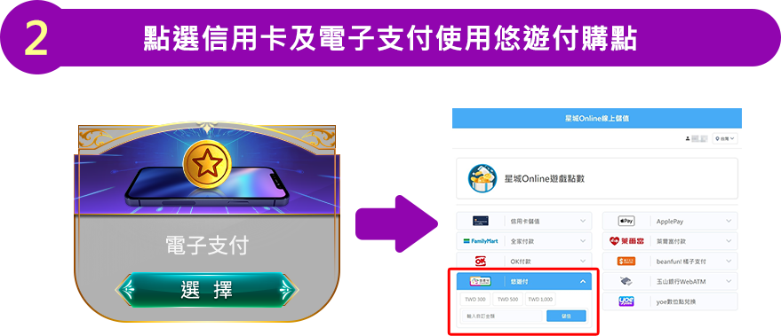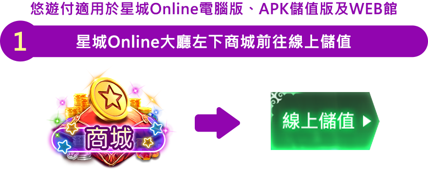 - 星城Online 立即下載Easy Wallet APP註冊悠遊付 本活動時間:2025/10/1 00:00起~2025/12/31 23:59止。 悠遊付適用APK儲值版、電腦版星城Online及WEB館。 星城Online遊戲內線上儲值購點參加活動,限於遊戲大廳左下進入【商城】內點選【線上儲值】並選擇於【悠遊付】;且不得與其他專屬優惠活動合併使用。 本遊戲為限制級,未滿18歲者請勿參與活動或遊玩。 網銀國際保留終止及變更本活動時間、辦法及內容的權利。